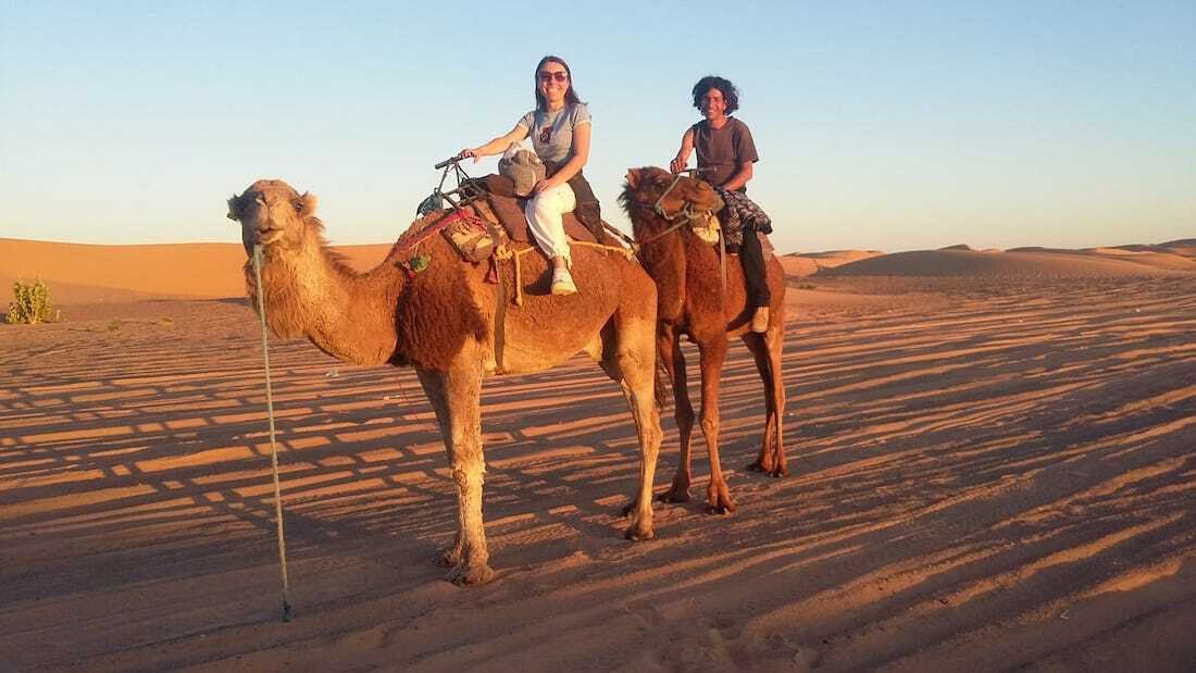 Paseo en camello, ya sea de solo 40 minutos o de varios días, si tu espalda o tu trasero te lo permiten 😉 Son animales amigables y normalmente no corren. ¡Ideal para los aventureros a los que no les gusta la velocidad!